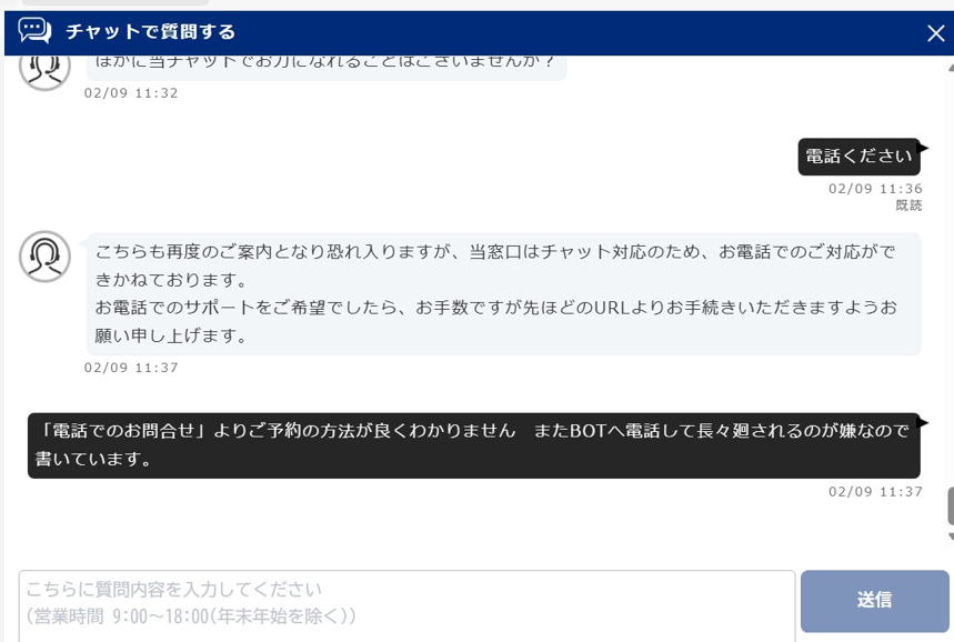 最後の質問に応えた途端、「その対応はしていないので」 最初の、「サービスダイアル」へ戻れ とのアナウンス後 ➡ ガチャンと 切電されました。
